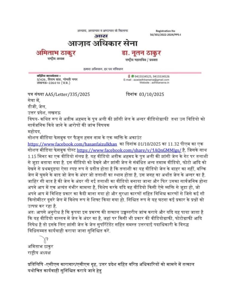 अतीक अहमद के बेटे अली अहमद का झांसी जेल में बनाए गए कथित वीडियो का मामला अब तूल पकड़ता जा रहा है। आजाद अधिकार सेना के राष्ट्रीय अध्यक्ष अमिताभ ठाकुर ने इस पूरे प्रकरण की जांच की मांग की है। उन्होंने जेल प्रशासन पर गंभीर आरोप लगाए हैं।