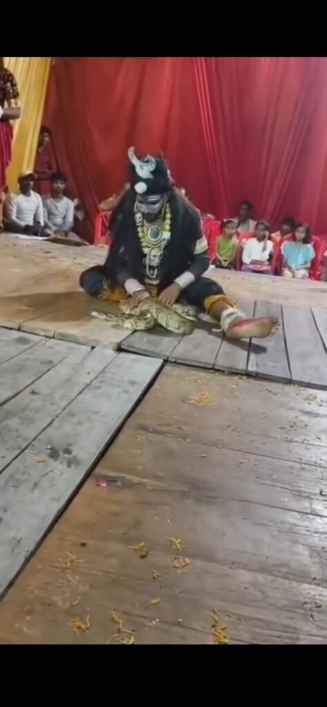वीडियो में भगवान शंकर की भूमिका निभा रहा युवक गले और हाथों में पांच फीट लंबा अजगर लपेटकर डांस करता नजर आ रहा है। भीड़ के बीच वह बार-बार अजगर का मुंह अपने मुंह में डालने की कोशिश करता है।
