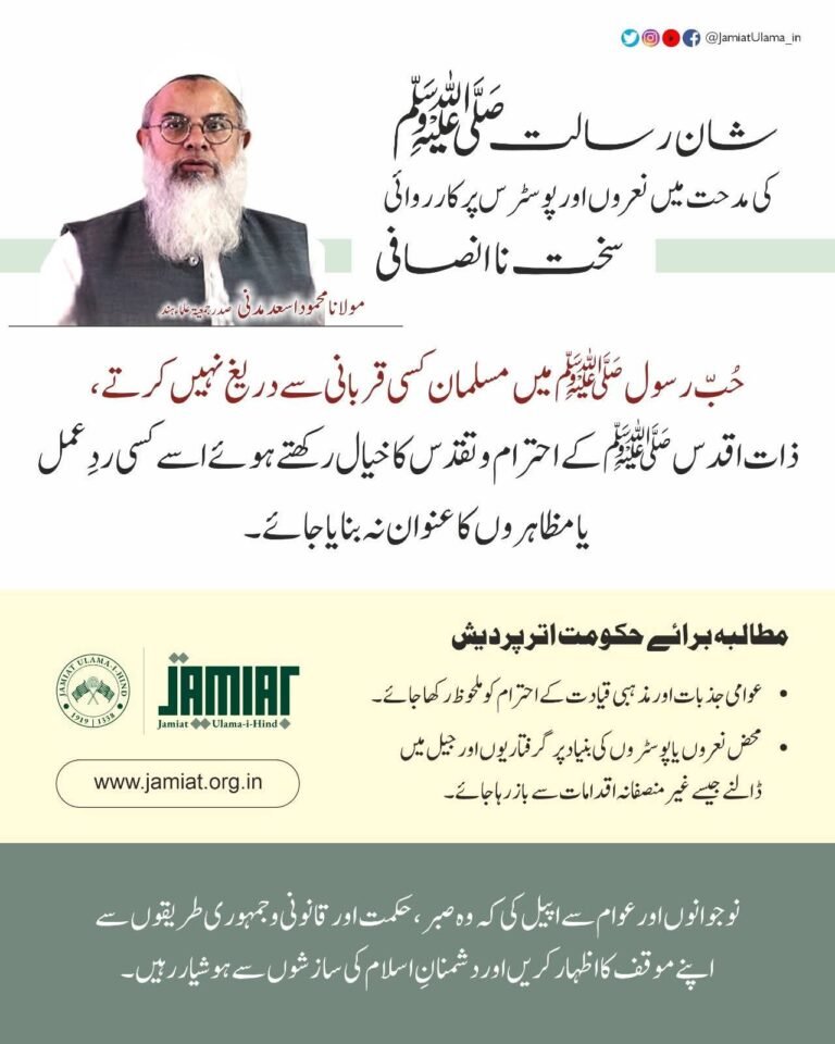 बोले: जनभावनाओं का सम्मान करे उत्तर प्रदेश सरकार देवबंद जमीयत उलमा-ए-हिंद के अध्यक्ष व पूर्व राज्यसभा सांसद मौलाना महमूद मदनी ने आई लव मोहम्मद कैंपेन पर उत्तर प्रदेश पुलिस की ओर से की जाने वाली कार्रवाई की निंदा करते हुए इस पर कड़ी नाराजगी जताई है। मौलाना मदनी ने कहा कि यह सरासर अन्याय और चिंताजनक है।मौलाना महमूद मदनी ने मंगलवार को जारी बयान में कहा कि पैगंबर मोहम्मद साहब के बिना हमारा सब कुछ अधूरा है, उन्हें प्यार करके ही अल्लाह को राजी किया जा सकता है, मुसलमान मोहम्मद साहब के नाम पर किसी भी तरह का बलिदान देने से पीछे नहीं हटता। मौलाना मदनी ने कहा कि इस तथ्य की ओर भी ध्यान दिलाया कि इस्लाम के मानने वालों की असल जिम्मेदारी यह है कि वह मोहम्मद साहब को अपने जीवन का आदर्श और मार्गदर्शक बनाएं और उनके व्यक्तित्व को किसी भी प्रतिक्रिया या विरोध का विषय न बनाया जाए, यह मोहम्मद साहब के सम्मान और पवित्रता के लिए भी जरुरी है। उन्होंने आई लव मोहम्मद को लेकर उत्तर प्रदेश पुलिस के रवैया की निंदा करते हुए प्रदेश सरकार से जनभावनाओं और धार्मिक पेशवाओं का सम्मान करने की मांग की, साथ ही कहा कि केवल नारों और पोस्टरों के आधार पर लोगों को गिरफ्तार कर जेल में डालना अन्यायपूर्ण कृत्य है, जिससे बचा जाना चाहिए।