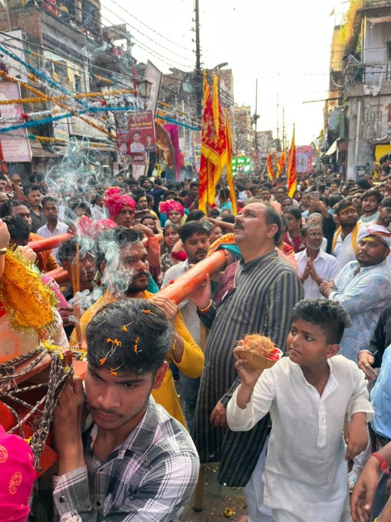 झांसी।दशहरा पर्व के पावन अवसर पर बड़ाबाजार स्थित मुरली मनोहर मंदिर के सामने मंगलवार को एक अभूतपूर्व दृश्य देखने को मिला। मां दुर्गा के विसर्जन से पूर्व श्रद्धा और भक्ति का एक विशाल जनसागर उमड़ पड़ा। हर वर्ष की भांति इस वर्ष भी प्रतिमा विसर्जन से पूर्व श्रद्धालुओं ने माता रानी को पुष्प अर्पित कर भावभीनी विदाई दी, लेकिन इस बार का आयोजन पहले से कहीं अधिक भव्य और भावुकता से भरा रहा। नगर विधायक रवि शर्मा एवं क्षेत्रीय अध्यक्ष प्रकाश पाल ने मंच पर उपस्थित होकर श्रद्धालुओं संग माता रानी की शोभायात्रा पर पुष्पवर्षा की। उनके साथ जिलाध्यक्ष हेमंत परिहार, पूर्व जिलाध्यक्ष संतोष सोनी सहित अनेक गणमान्य नागरिक भी मौजूद रहे।विधायक रवि शर्मा ने इस अवसर पर कहा— “यह केवल विसर्जन नहीं, बल्कि हमारी आस्था और संस्कृति की जीवंत झलक है। मां दुर्गा हर वर्ष आकर हमें एकजुट करती हैं और उनका विदा होना हमें अगले मिलन का इंतजार दे जाता है।” खटकयाना वाली मां काली बनीं आकर्षण का केंद्र इस बार की शोभायात्रा में विशेष रूप से प्रस्तुत खटकयाना वाली मां काली का अलौकिक स्वरूप श्रद्धालुओं के आकर्षण का केंद्र बना रहा। उनकी भव्यता और जीवंत प्रस्तुति ने पूरे वातावरण को भक्तिमय बना दिया। श्रद्धालु मंत्रमुग्ध होकर “जय माता दी” के जयकारों में लीन हो गए। हजारों श्रद्धालुओं की उमड़ी भीड़ पूरे कार्यक्रम के दौरान सुरक्षा व व्यवस्था के पुख्ता इंतज़ाम रहे। हजारों श्रद्धालुओं ने शोभायात्रा में भाग लेकर न केवल अपनी आस्था व्यक्त की, बल्कि सांस्कृतिक एकता की मिसाल भी पेश की। हर गली, हर सड़क माता रानी के जयकारों और ढोल-नगाड़ों से गूंज उठी।विसर्जन के दौरान शहर के विभिन्न स्थानों की दुर्गा माताओं की शोभायात्रा भी भव्य रूप से निकाली गई। इस अवसर पर पूर्व जिलाध्यक्ष संतोष सोनी, अरविन्द पुरी कल्लू, सभासद मुकेश सेनी बंटी, पंकज राय, अरविन्द खटीक, पप्पू यादव, पूर्व सभासद अनिल सोनी, परन शर्मा, विवेक परिहार, स्वराज स्वामी, गोकुल दुबे, हेमंत प्रताप सिंह, कविता शर्मा, श्रीमती सुनीता शर्मा, कुसुम कुशवाहा, राधा दुबे, पिछड़ा मोर्चा अध्यक्ष कपिल बिरसैनिया, विनीत पचौरी, नीरज गुप्ता, मंडल अध्यक्ष दिलीप पुरी, मोनू शिवहरे, अभिषेक जैन, सौरभ वाजपेयी, विनय उपाध्याय सहित हजारों की संख्या में लोग मौजूद रहे।